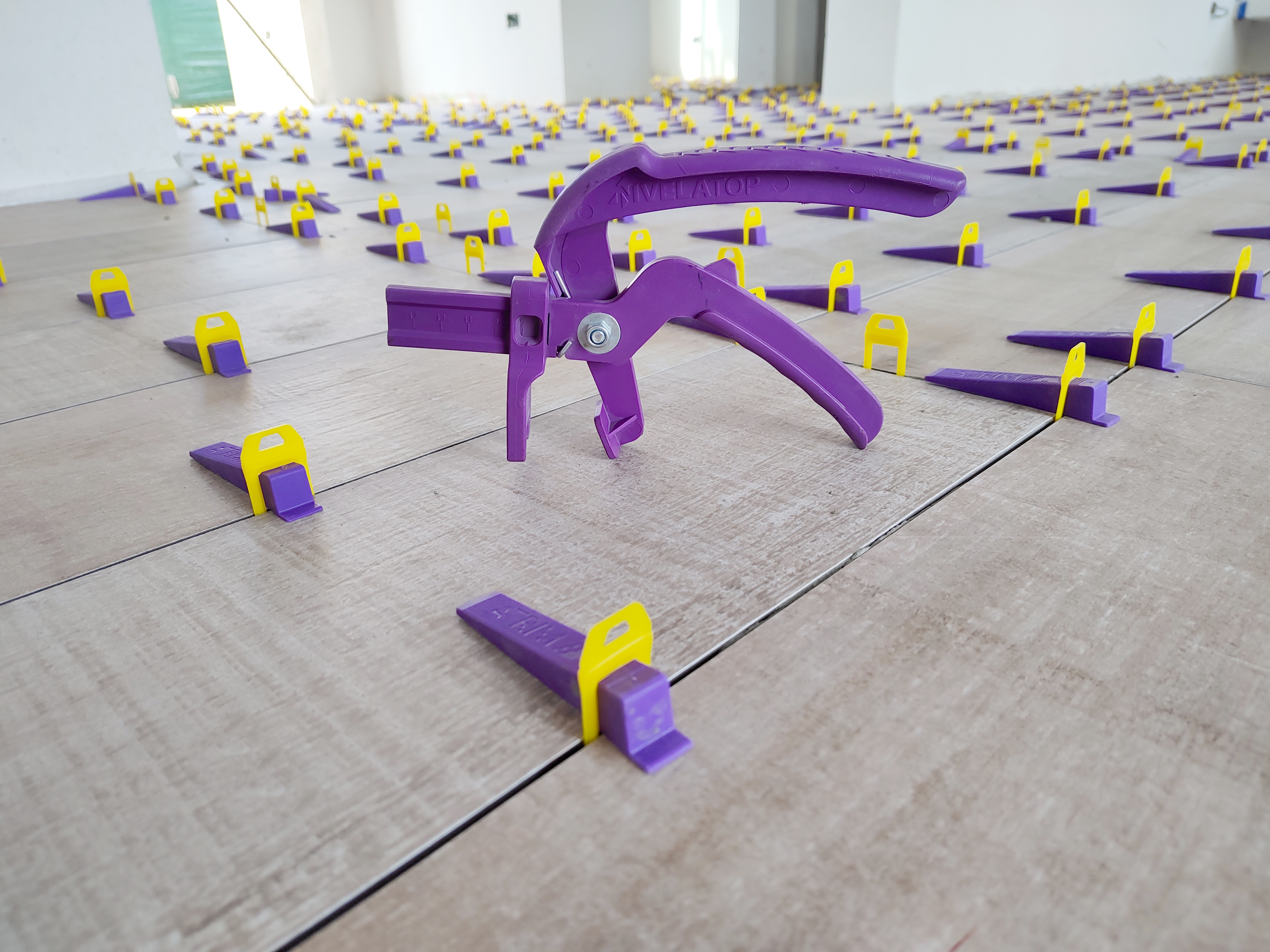 Kit Autonivelante compuesto por Cuñas (reutilizables), Clips Autonivelantes y Pinzas niveladoras para la colocación de cerámicos y porcellanatos de paredes y pisos.