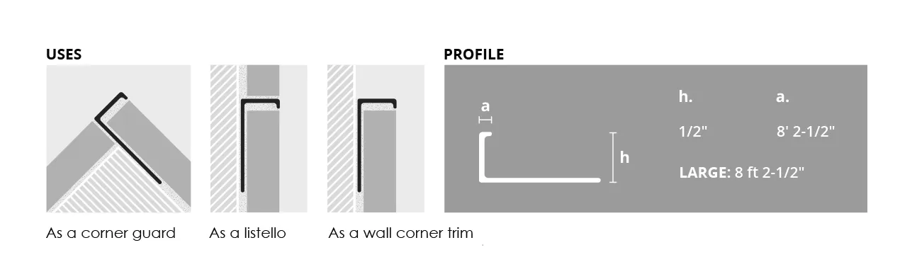 Right-angle aluminum profile 1/2" x 8' 2-1/2" visible face. Versatile, with a slim appearance and simple design that elegantly creates subtle lines on wall coverings.