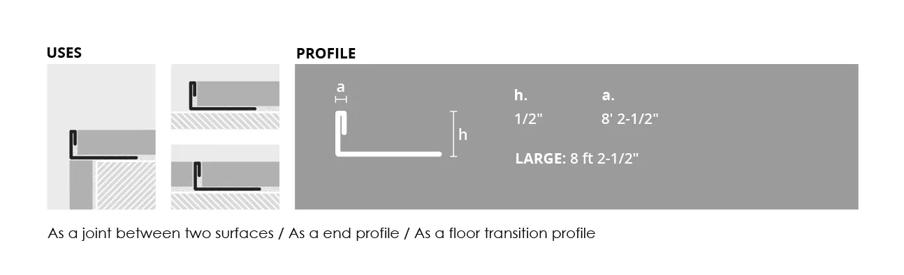 1/2" x 8' 2-1/2" right-angle profile made of frosted and polished 304 stainless steel. Delicate design that separates different coatings and marks out areas on the floor, creating subtle and minimalist lines.