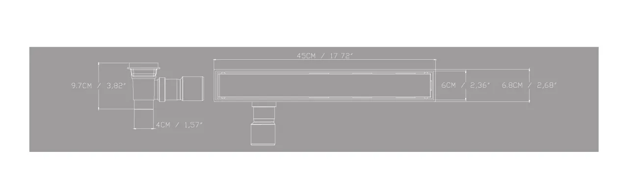 Linear drain with ABS polymer body and AISI 304 stainless steel grate. Optimal water drainage. Built-in siphon for easy cleaning. Resistance to traction and compression. High durability.