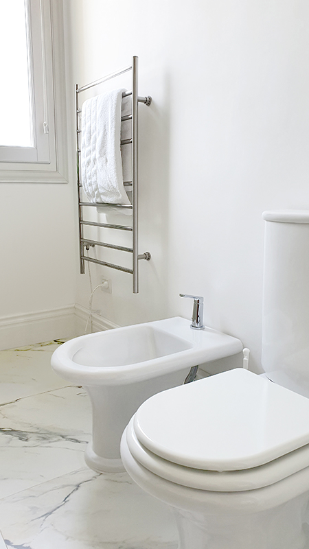 El acero inoxidable es el más utilizado por su resistencia a la humedad y bajo mantenimiento. Las terminaciones —negro mate, blanco, cromado— deben integrarse al criterio general del baño y sostener su durabilidad en ambientes húmedos.