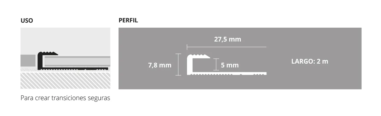 Perfil de aluminio diseñado para crear transiciones seguras entre pisos vinílicos de 5 mm de espesor o superior en el mismo nivel y proteger el canto de las placas. Puede utilizarse como terminación en paredes y muros a 90 grados.