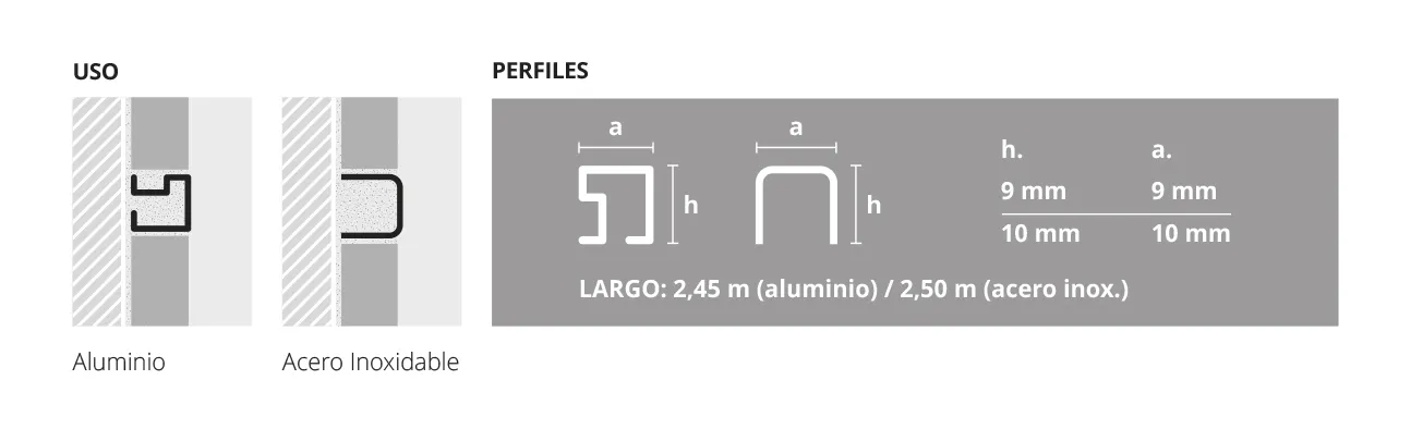 Perfil de acero inoxidable esmerilado de 16 mm con bordes perfectamente rectos. Puede utilizarse para remarcar los bordes o entre revestimientos. De gran resistencia y durabilidad.