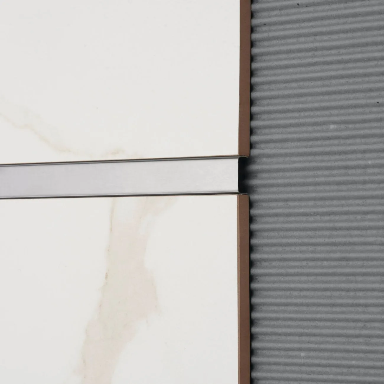 Perfil de acero inoxidable esmerilado con 10 mm de cara visible que se utiliza como guarda entre diferentes tipos de revestimientos. Su diseño fino permite crear detalles minimalistas en acero.