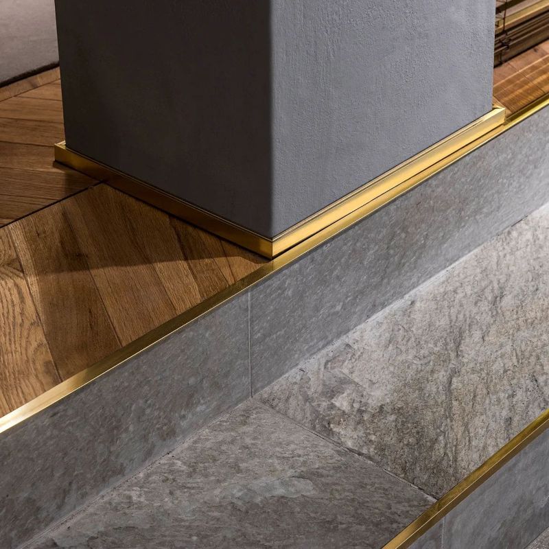 Perfil de aluminio de 10 mm de vista cuadrada que acompaña griferías y diseños rectos. Protege la unión de los revestimientos logrando un diseño moderno.