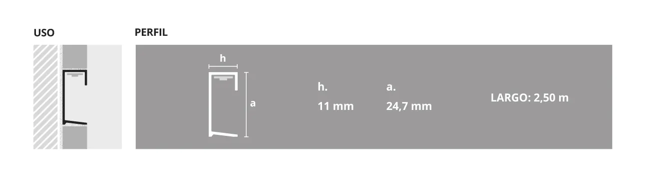 Perfil de aluminio para LED de uso decorativo, terminación en paredes o zócalo. Genera un efecto difusor. Según su posición consigue distintos efectos de luz. Se instala junto con el revestimiento. Provisto de terminales.