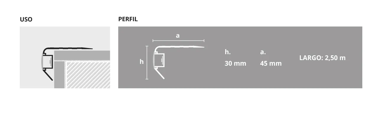 Perfil de aluminio para LED de 45 mm de pisada, cubierto por un acrílico de alto impacto, orientada hacia el frente ideal para escaleras de interior, se instala luego del revestimiento. Cuenta con terminales.