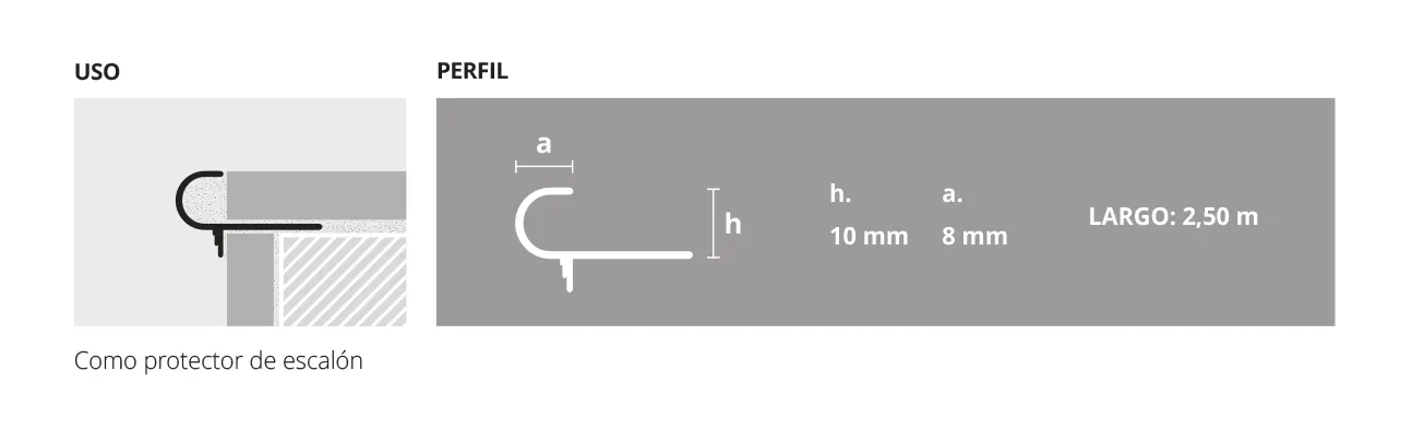 Perfil de aluminio de 5 mm, crea cantos redondeados en escaleras revestidas de pisos vinílicos. Protege los bordes, aporta mayor resistencia y durabilidad al peldaño y una terminación prolija.