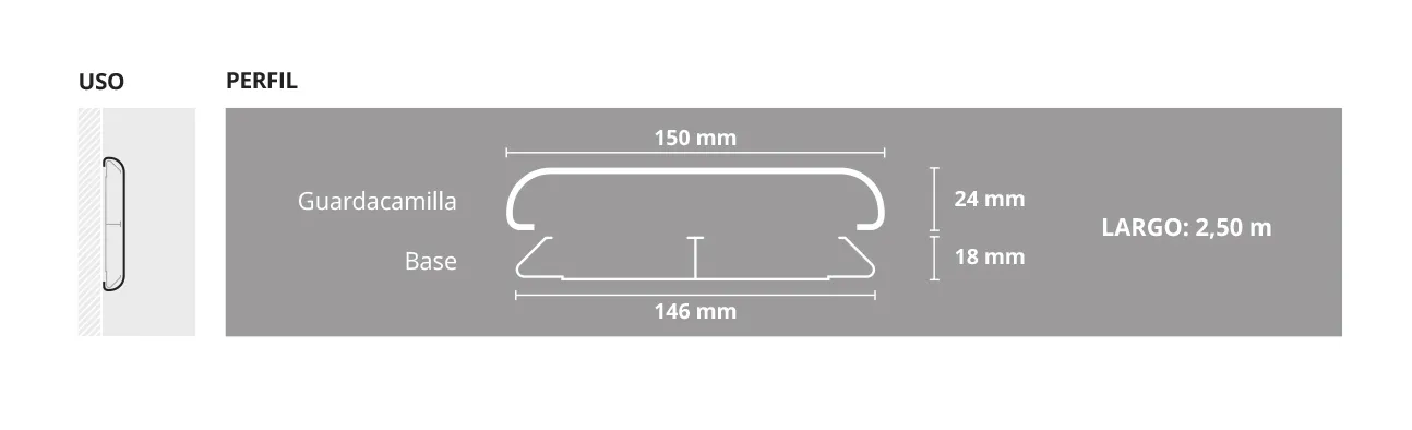 Frente de guardacamilla de aluminio y tapa de PVC de alto impacto. Para protección de las paredes de roces y golpes. Se vende junto a la Base del guardacamilla