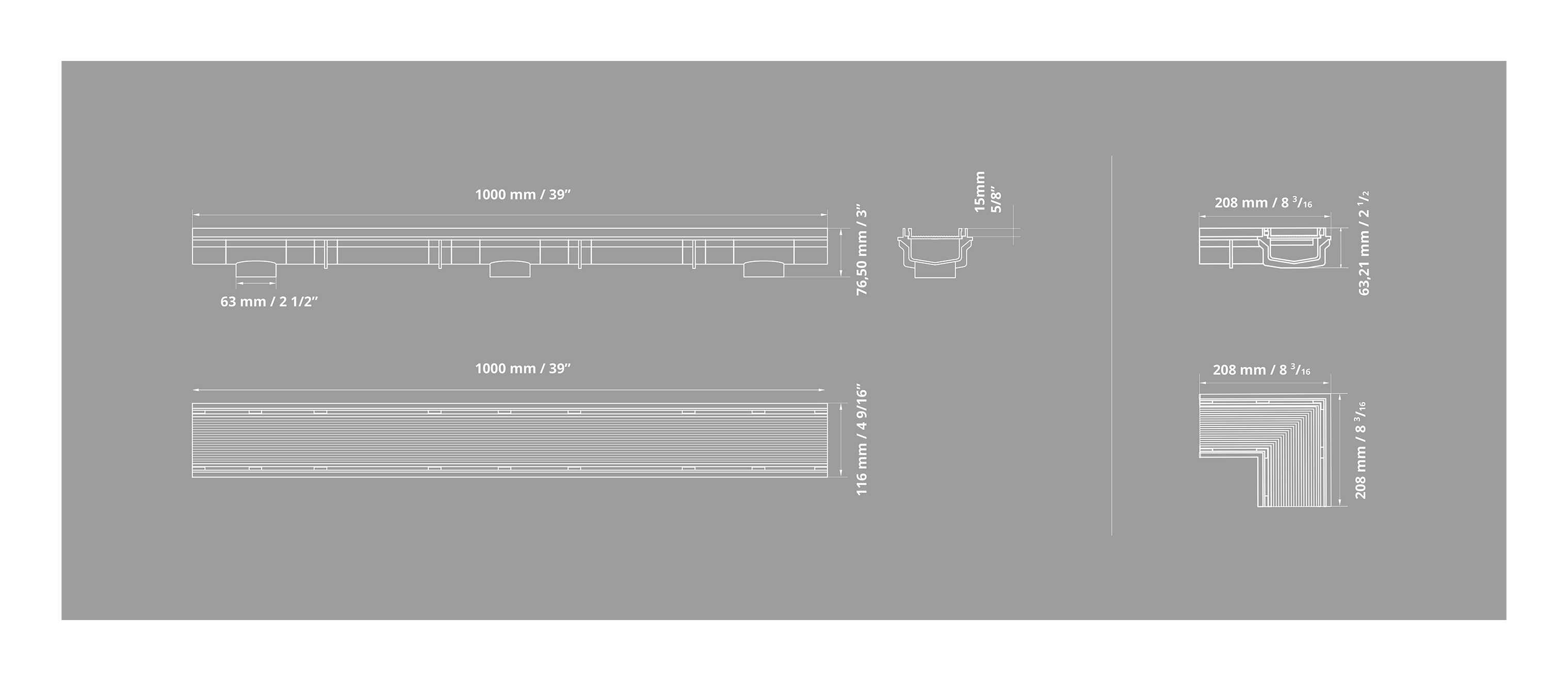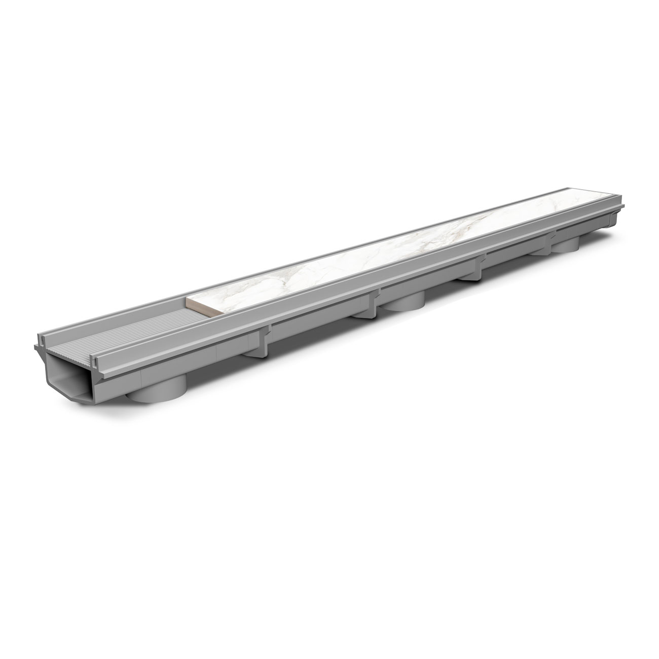 Desagüe modular revestible, apto para instalación en ambientes exteriores e interiores. Es “infinito”, ya que se puede cortar a medida y unir con pegamento. Su diseño oculto y adaptable a distintos revestimientos garantiza una integración perfecta. Kit completo que incluye el cuerpo del drenaje y 2 tapas de terminación. Fácil de instalar, se puede colocar de manera lateral en pisos del baño y es ideal para terrazas, patios, zonas de piscina, spa, balcones y roof gardens.