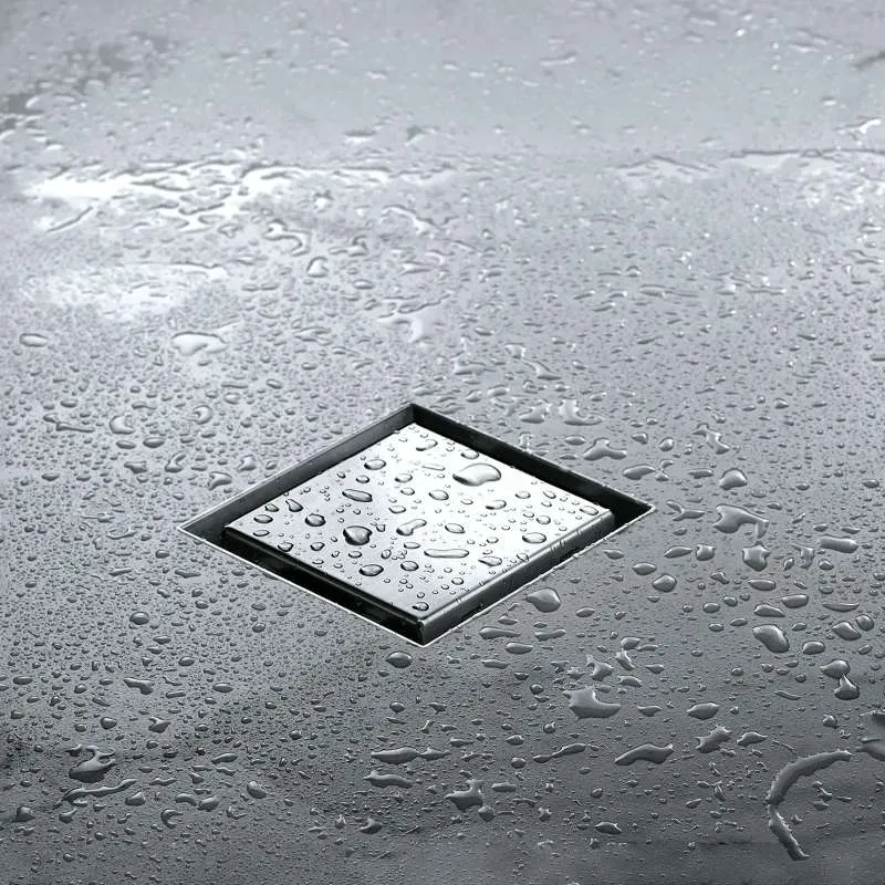 Desagüe cuadrado de acero inoxidable AISI 304. Ofrece dos opciones de tapas en un único producto: Clásica, con un acabado esmerilado y Ceramic, cuyo lado posterior es hueco y permite insertar el revestimiento.