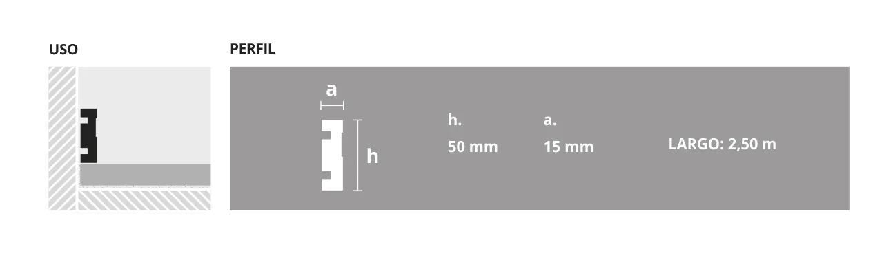 Contramarco de EPS (poliestireno expandido reciclado). Diseño de cara plana y línea bajo relieve que cubre la junta perimetral. Ideal para acompañar zócalos Line y Extra Line. Colores de tendencia.