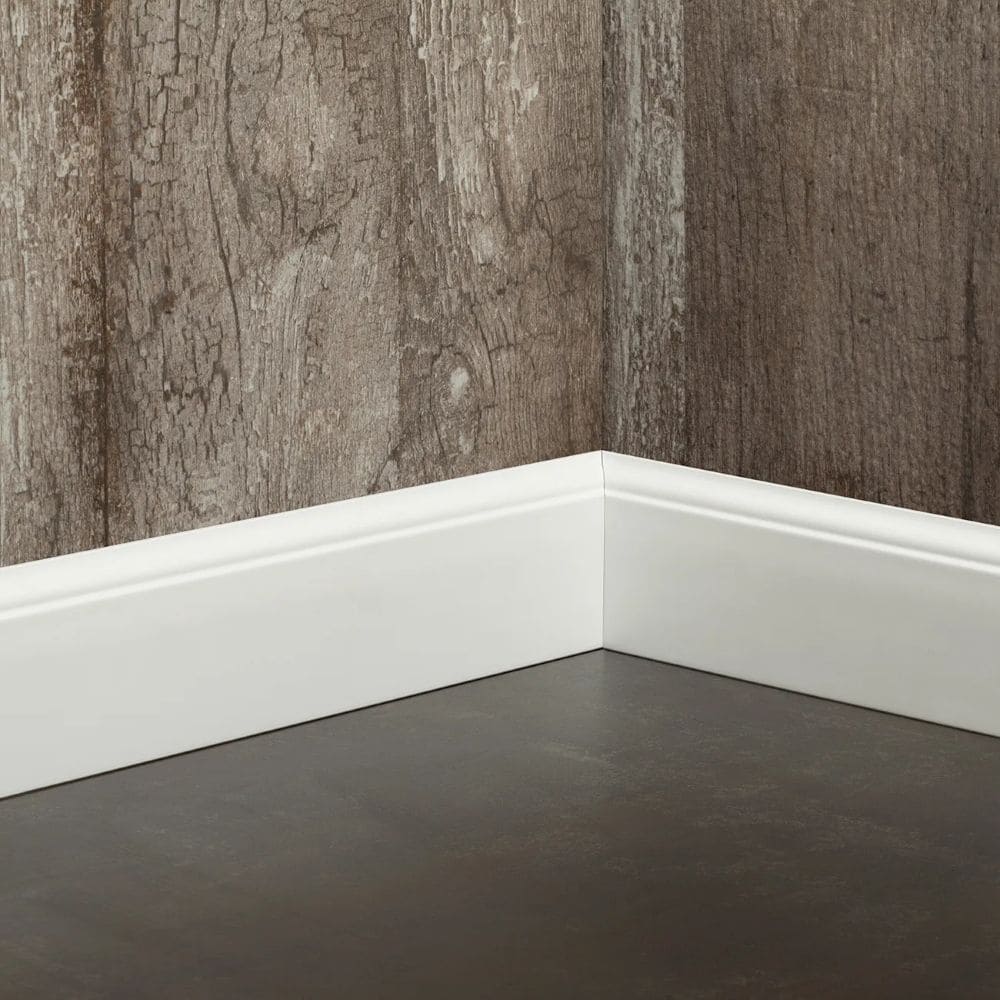 Zócalo blanco pintable de EPSILON, de diseño tradicional que otorga una visual continua a la unión con la pared.