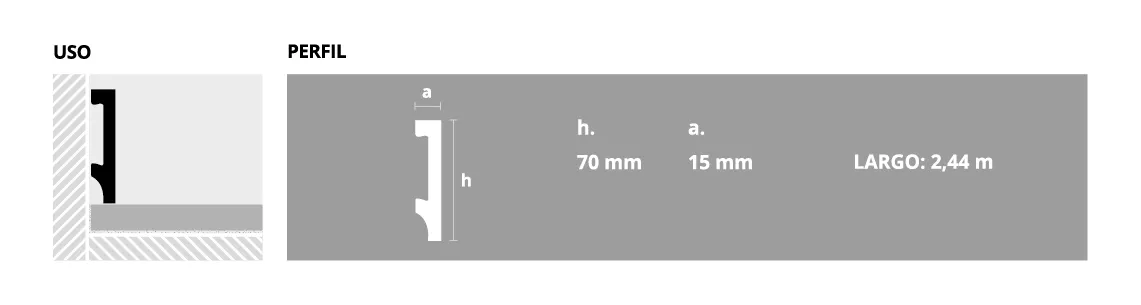 Zócalo de EPSILON acabado madera, con diseño plano y líneas rectas, adaptable a todos los estilos.