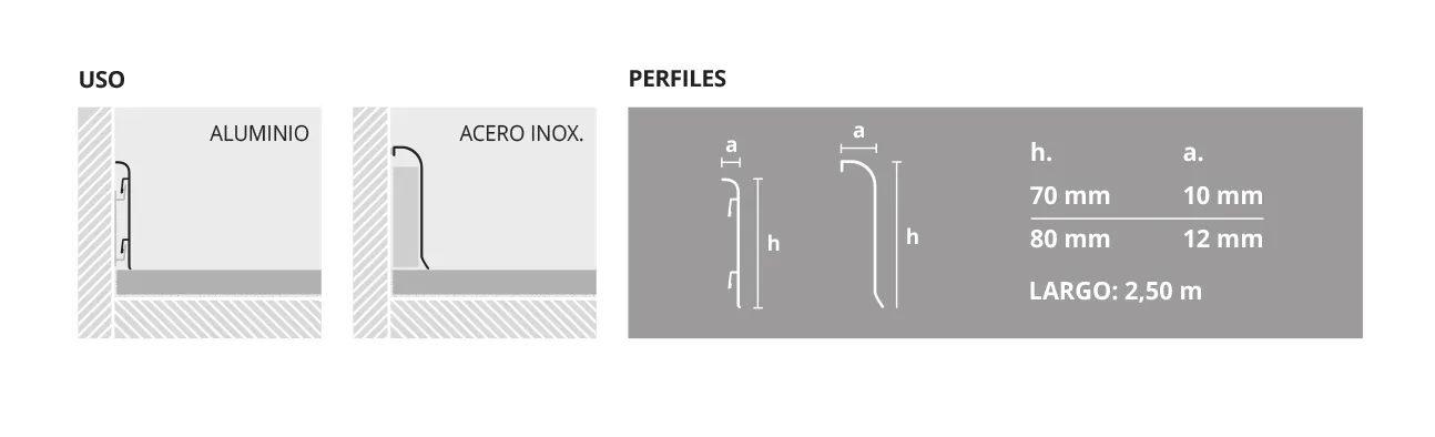Zócalo de acero inoxidable esmerilado. Se utiliza como unión entre las paredes y los pisos. Son fáciles de instalar, resistentes y de fijación invisible. Provisto de un listón de madera que se sujeta a la pared.