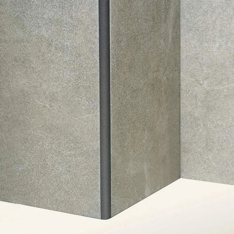 Perfil de aluminio de 12 mm textura piedra con diseño curvo prolongado que protege los bordes e integra la unión de los revestimientos. Recomendado para porcelanatos rectificados