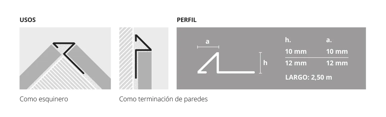 Perfil de aluminio de 12 mm de diseño triangular que protege y decora uniones de revestimientos otorgándoles una vista elegante y vanguardista