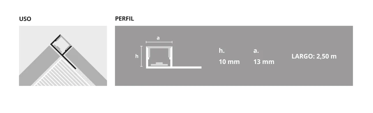 Perfil de aluminio anodizado de 10 mm para Led para diseñar líneas rectas en paredes o bordes de columnas. Su tapa difusora genera un efecto lumínico homogéneo. Provisto de terminales y difusor de policarbonato.