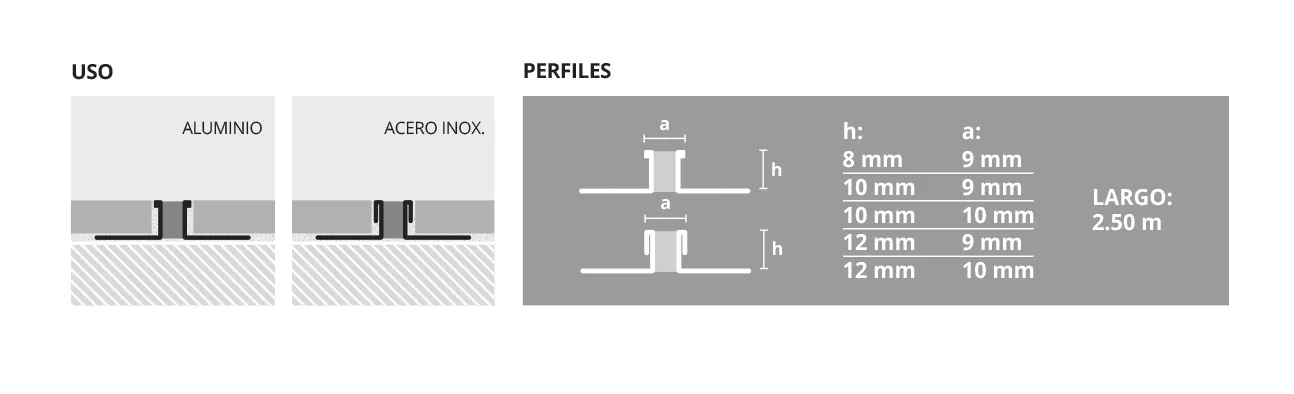Perfil de aluminio de 10 mm formado por dos tramos de metal en los extremos, unidos en el centro por una pieza de poliuretano, compensa de manera eficiente y absorbe movimientos del suelo junto con los materiales.