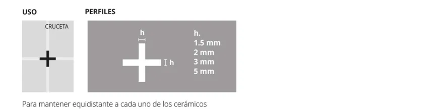 Crucetas espaciadoras de PVC en formato T o X diseñadas para alinear con exactitud los revestimientos, asegurando una separación pareja y limpia en las uniones. Gran variedad de medidas desde 1.5mm hasta 8mm.