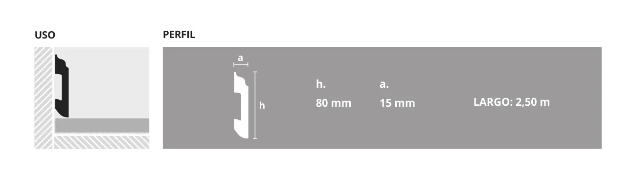 Guardapolvo de EPS (poliestireno expandido reciclado) de diseño tradicional que otorga una visual continua a la unión con la pared. Solución estética para proteger paredes de posibles manchas a nivel de los zapatos.