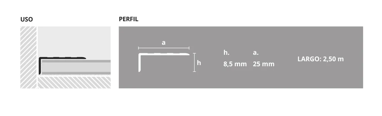 Perfil de aluminio anodizado con 25 mm de cara visible. Se utiliza para unir el borde del piso flotante con la pared o puerta balcón. Se coloca con adhesivo o tornillos posteriormente a la instalación de los pisos.