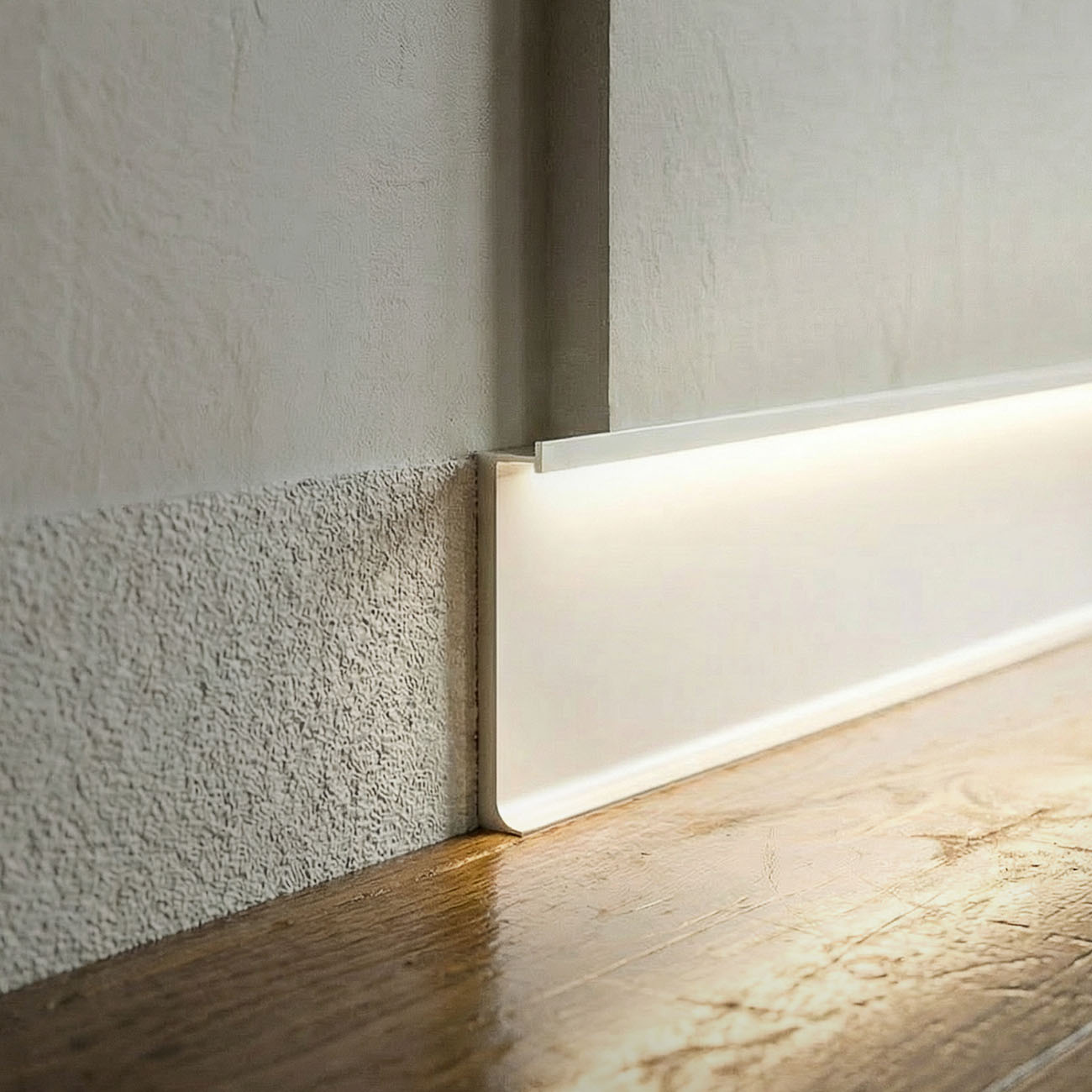 uso en interiores. Con una altura de 70 mm, el perfil se instala en la parte inferior del muro, generando