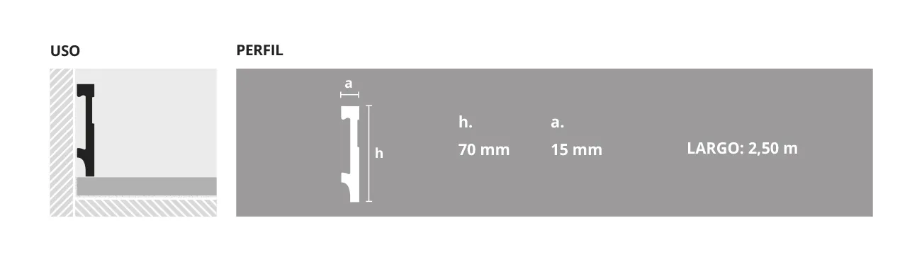 Guardaescobas de EPS (poliestireno expandido reciclado) blanco pintable, de 70 mm de altura, de diseño vanguardista, cuenta con una línea bajo relieve como detalle decorativo. Colores en tendencia. Cuenta con clips de fijación.