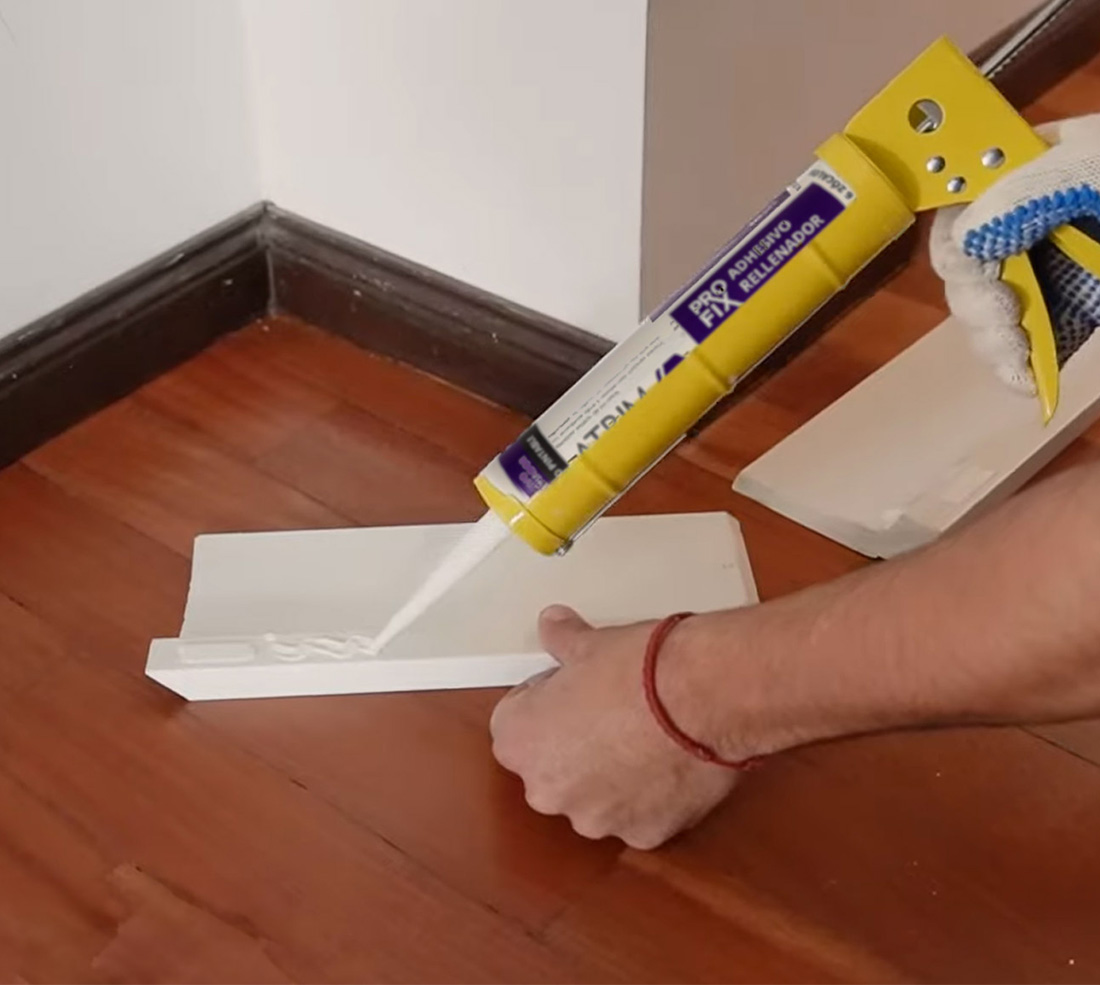 Adhesivo rellenador para guardaescobas sobre placas de yeso, maderas, cerámicos y porcelanatos.