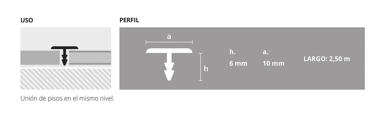 Perfil transicional de aluminio anodizado 6063 T5, diseñado para transiciones estéticas entre pisos de hasta 6 mm de espesor, al mismo nivel, y para cubrir juntas de 3 a 6 mm.