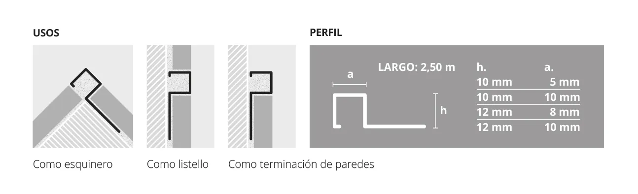 Perfil de aluminio de 10 mm de vista cuadrada que acompaña griferías y diseños rectos. Protege la unión de los revestimientos logrando un diseño moderno.