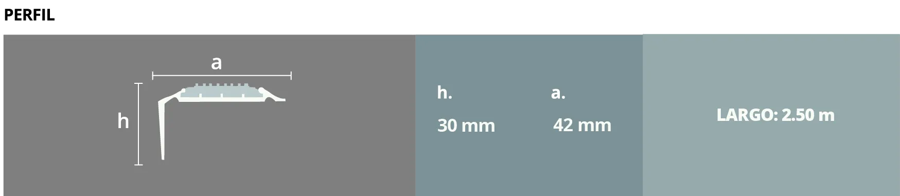 Perfil de aluminio de 20 mm provisto de perforaciones, ideal para escaleras de interior revestidas con cerámicos, alfombras o pisos flotantes, se instala luego de instalado el revestimiento.
