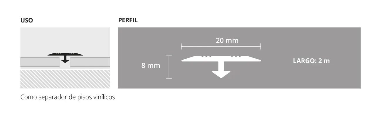 Perfil de aluminio diseñado para transiciones estéticas en las uniones de pisos vinílicos de 3, 4, 5 y 8 mm de espesor. Evita la formación de escalones y cubre los bordes de los revestimientos.