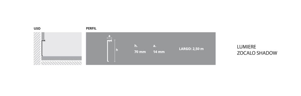 uso en interiores. Con una altura de 70 mm, el perfil se instala en la parte inferior del muro, generando