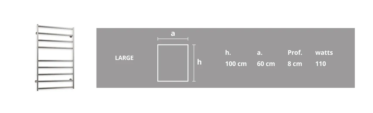 Toallero eléctrico premium de acero inoxidable de 60 x 100 x 8 cm - 110 watts. Son de bajo consumo, con switch de ahorro de energía. Las líneas rectas acompañan griferías de diseño vanguardista.