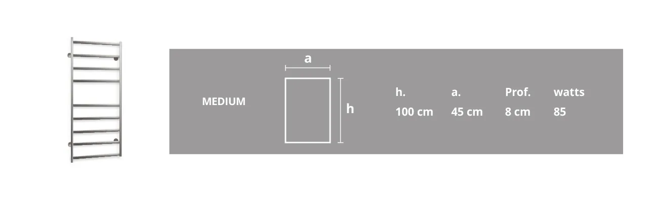 Toallero eléctrico premium de acero inoxidable de 45 x 100 x 8 cm - 110 watts. Son de bajo consumo, con switch de ahorro de energía. Las líneas rectas acompañan griferías de diseño vanguardista.