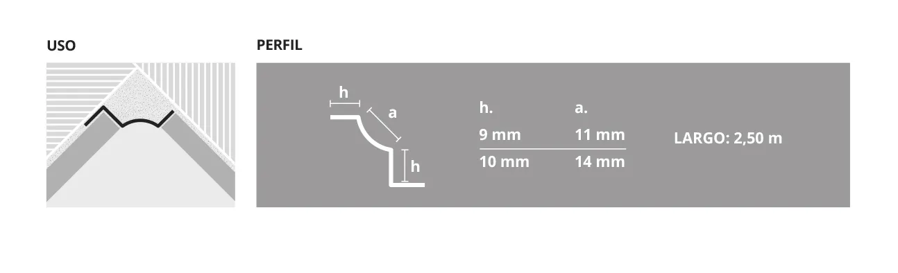 Perfil de acero inoxidable AISI 304 con 14 mm de cara visible y dos alas de fijación de 10 mm de altura. Por su resistencia a productos químicos mantiene la higiene en hospitales y cocinas industriales.