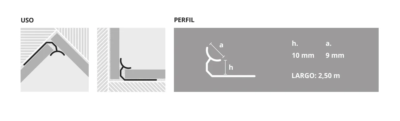 Perfil de aluminio anodizado con 9 mm de cara visible y curvatura interna que otorga una terminación prolija a la unión de superficies adyacentes de los cerámicos en el mismo nivel.