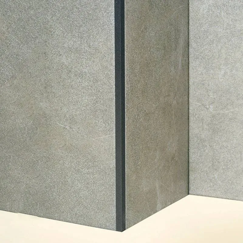 Perfil de aluminio de 10 mm con textura piedra de vista cuadrada que acompaña griferías y diseños rectos. Protege la unión de los revestimientos logrando un diseño moderno.