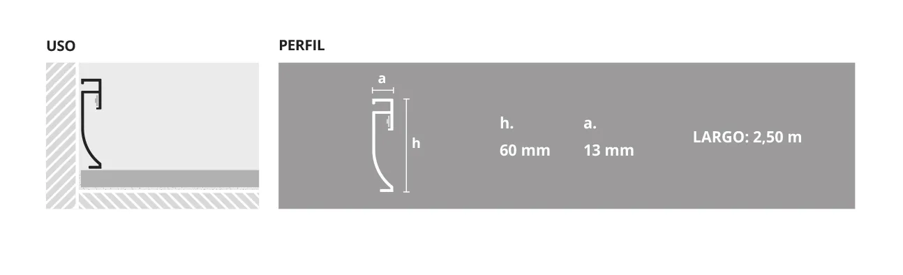 Zócalo de aluminio anodizado empotrable de 60 mm con canal para tira de LED. Su diseño vanguardistas semi curvo permite iluminar creando efectos cromáticos que definen los espacios. Cuenta con terminales.