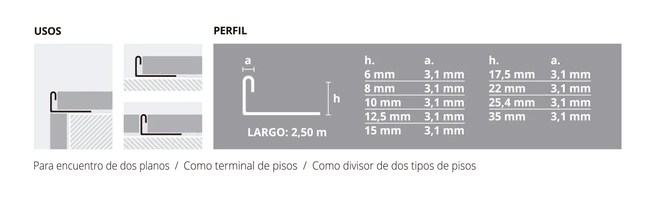 Perfil de acero 304 esmerilado de ángulo recto de 2 mm. Vista delicada para separar revestimientos, creando líneas sutiles y minimalistas.