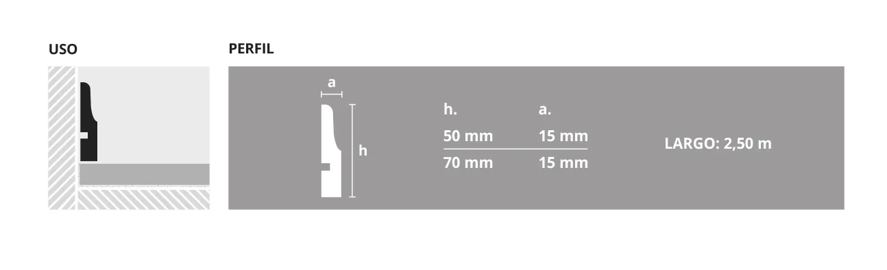 Zócalo de EPS (poliestireno expandido reciclado) de 50 mm de cara visible. Su silueta ligera en forma de S, base recta y curvatura suave en el centro, envuelve las puertas con elegancia contemporánea.
