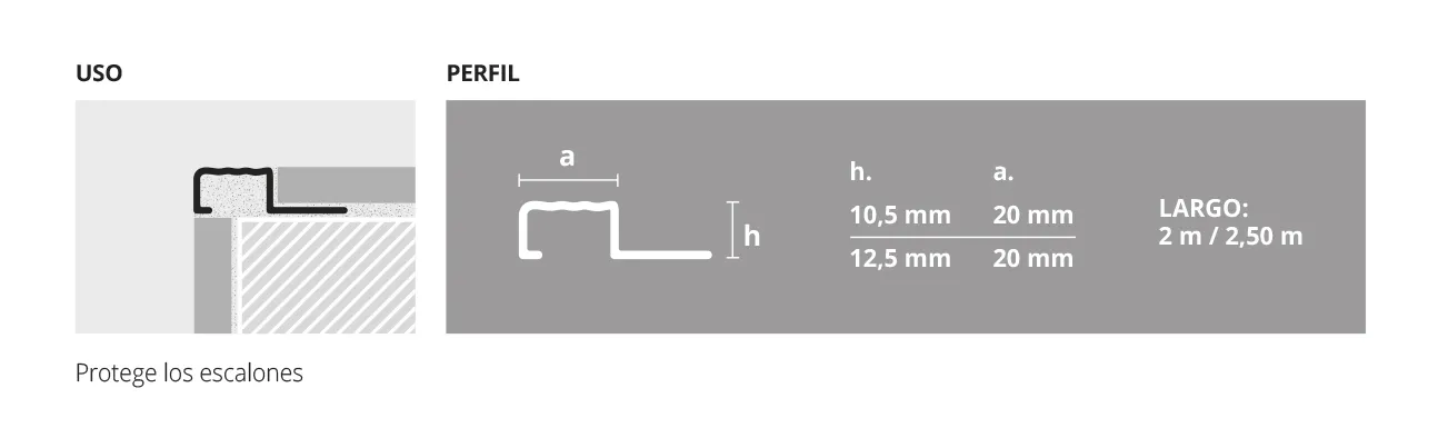 Perfil de aluminio de 10.5 mm de alta resistencia y gran versatilidad, ideal para proteger y resaltar los escalones en ambientes de tránsito medio.
